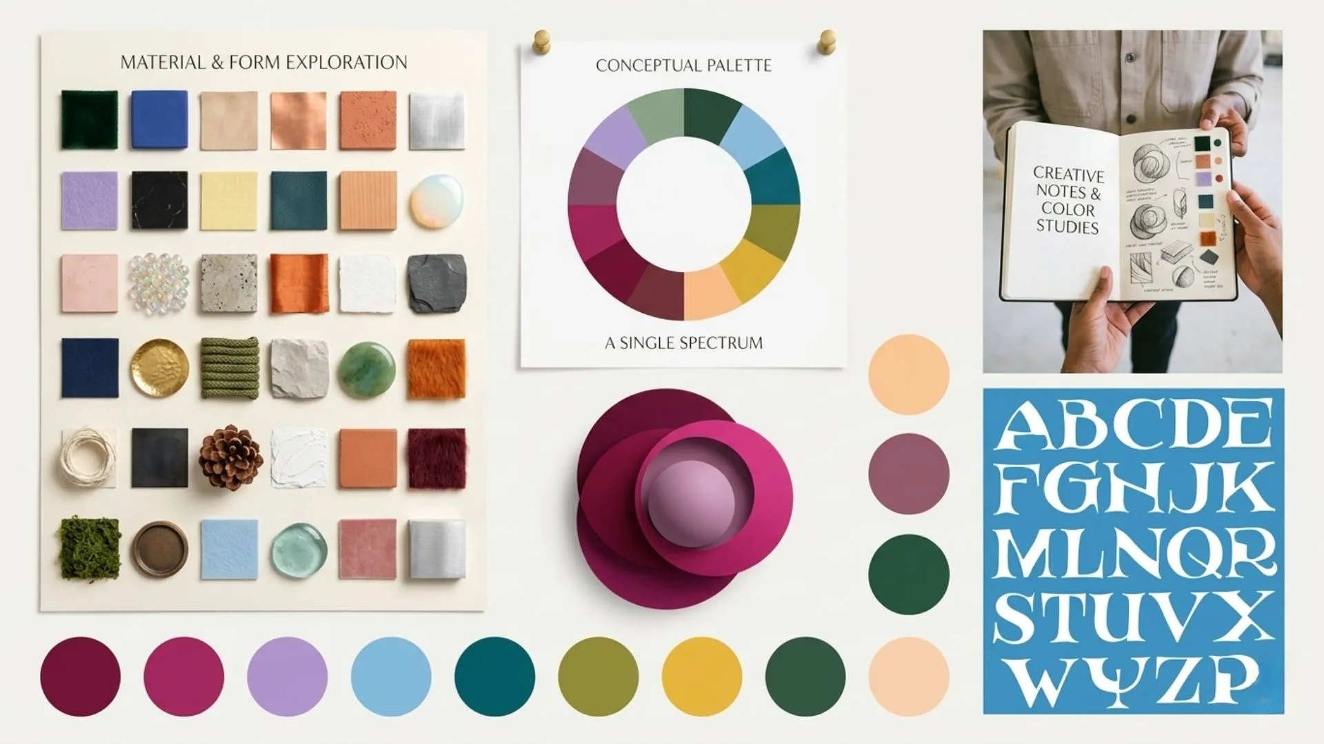 6. Material-contrast moodboards — Pair opposing textures intentionally. Rough concrete against soft silk. Cold steel against warm wood. The tension between materials creates visual energy that drives bold creative directions.